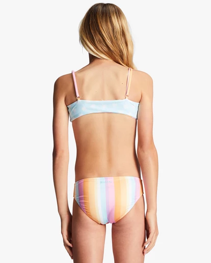 Made of recycled stretch fabric, this printed bikini set for girls includes a reversible trilete top in a comfy pullover design with a matching bottom.