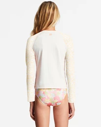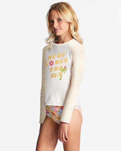 Designed with printed sleeves and Billabong graphics at the chest, this girls’ long-sleeve rashguard top is made of recycled stretch fabric with enhanced sun protection for all-day surf sessions.