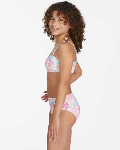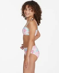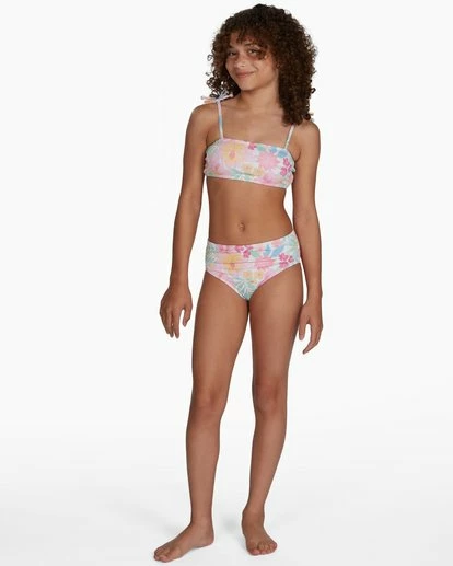 Bloom your brightest with the Girls’ Brighter Days Strappy Tank bikini set. Ideal for beach day fun and games, it features a bright floral print on stretchy recycled poly material. The set includes a high-rise, full-coverage bottom and a bandeau top with functional shoulder ties.
